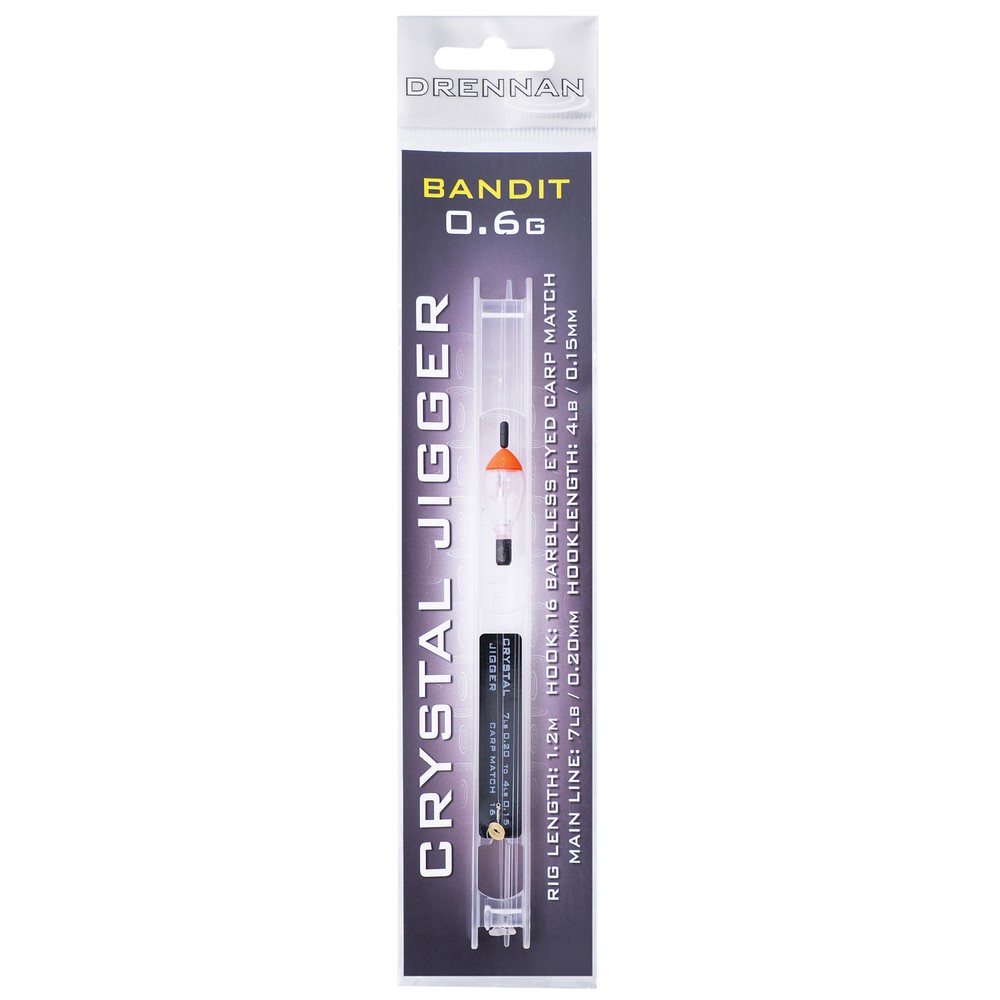 The Drennan Crystal Jigger Hooker Pole Rig is a hand-tied, shallow fishing rig available in 0.4g and 0.6g weights, ideal for pellets, maggots, and casters.