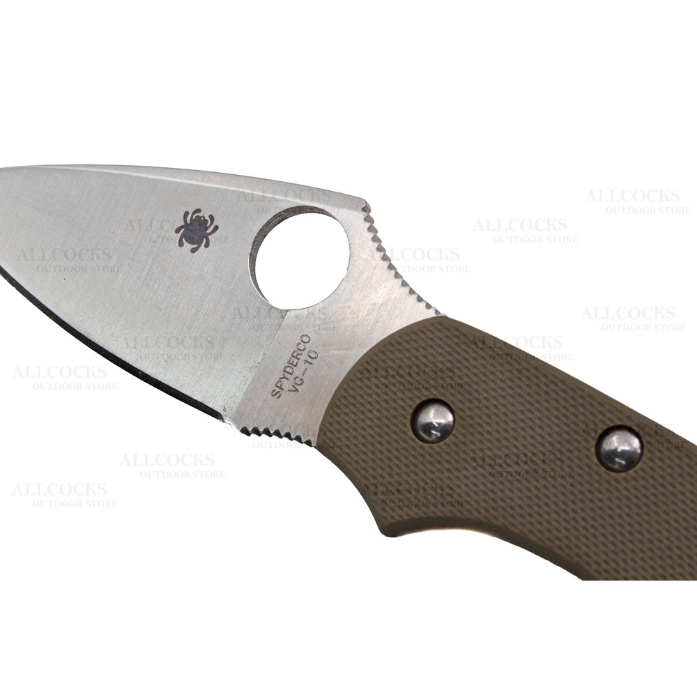 The VG-10 steel is tooled into a full flat-grind 2.25" long blade with jimping along the top where the thumb naturally settles itself for control over the cutting edge. The G-10 handle is ergonomically blueprinted, so when held and used the knife feels and performs like a larger tool. Even the positioning of the Spyderco Round Opening Hole in relation to the pivot is tweaked for smooth opening and hitting all the correct pressure points in the hand. Blade and handle geometry create a series of grip angles with a purposeful flat shelf at the base where the pinkie finger rides as a leverage point.